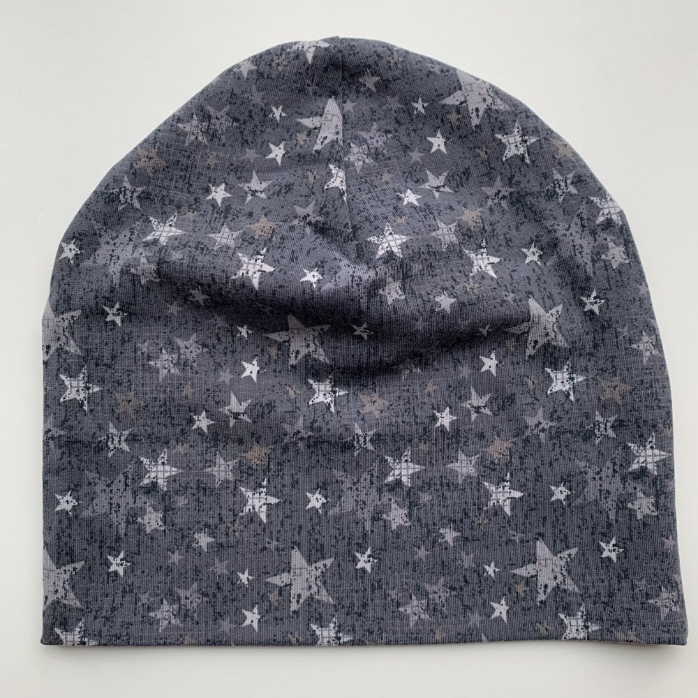 Hue i blødt bomuldsjersey. Huen kan bruges som en løs/"baggy" model eller med opsmøg - her sidder huen til hovedet.